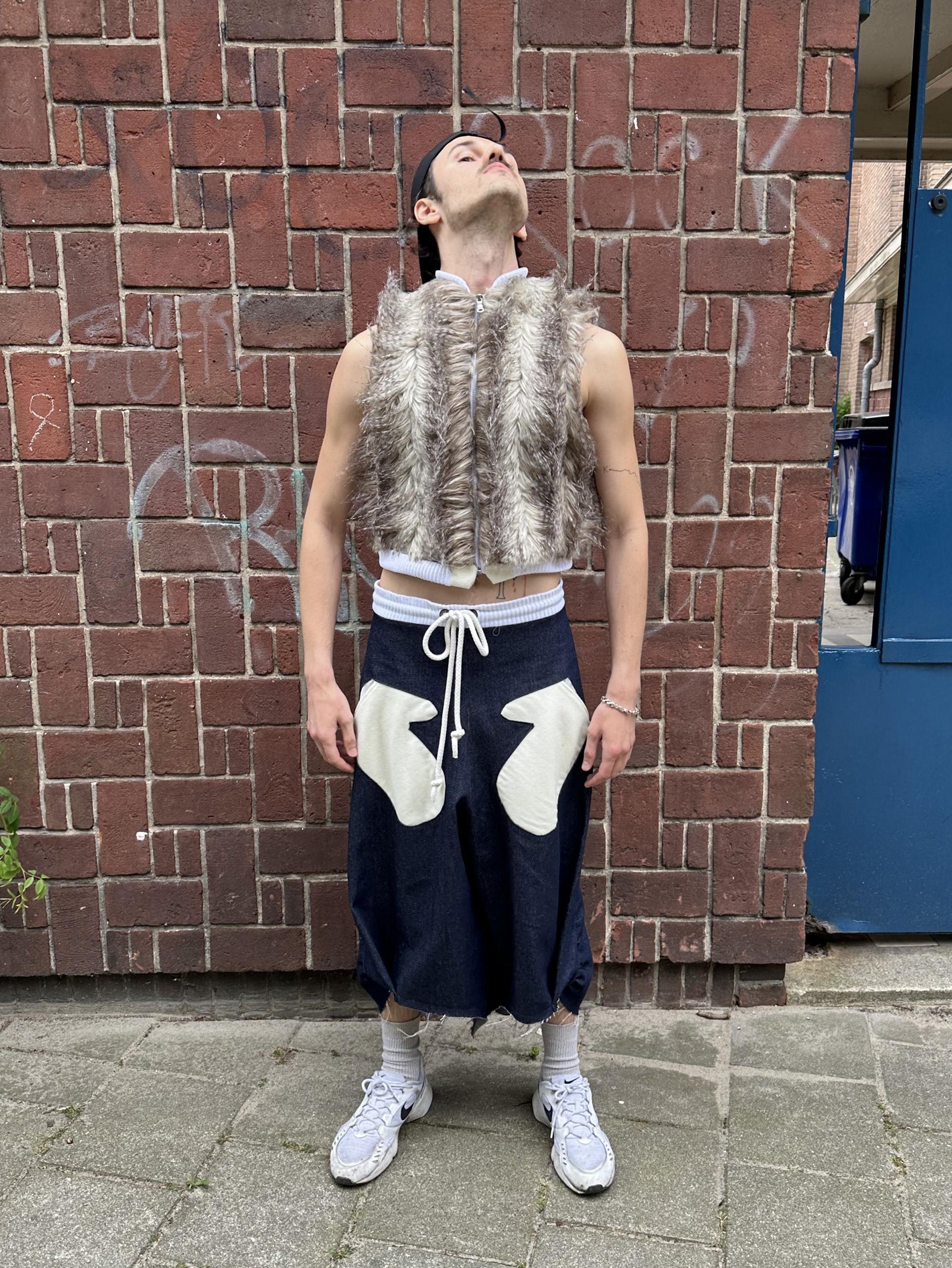 Realised outfit, using faux fur, raw denim and white rib for finishings.