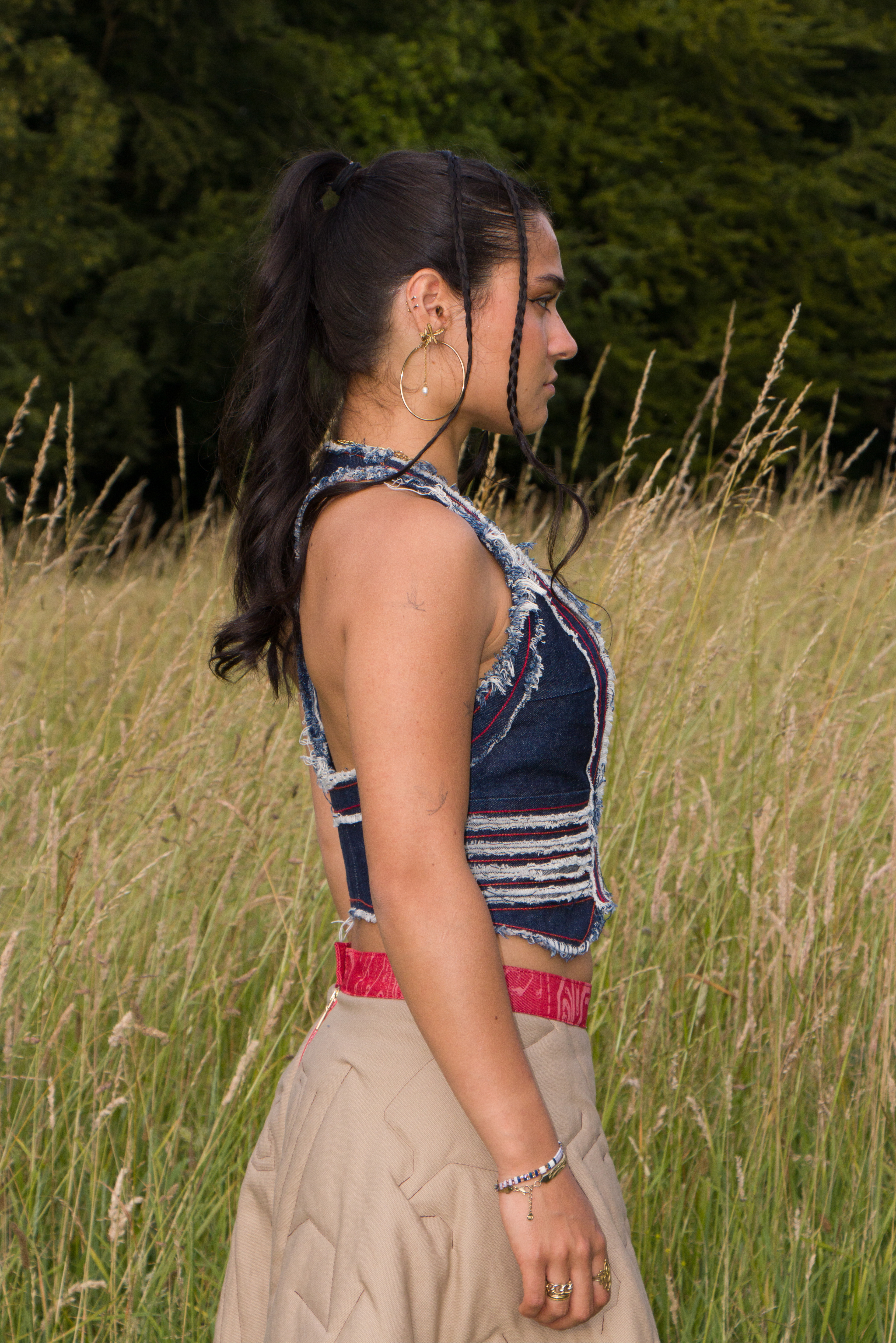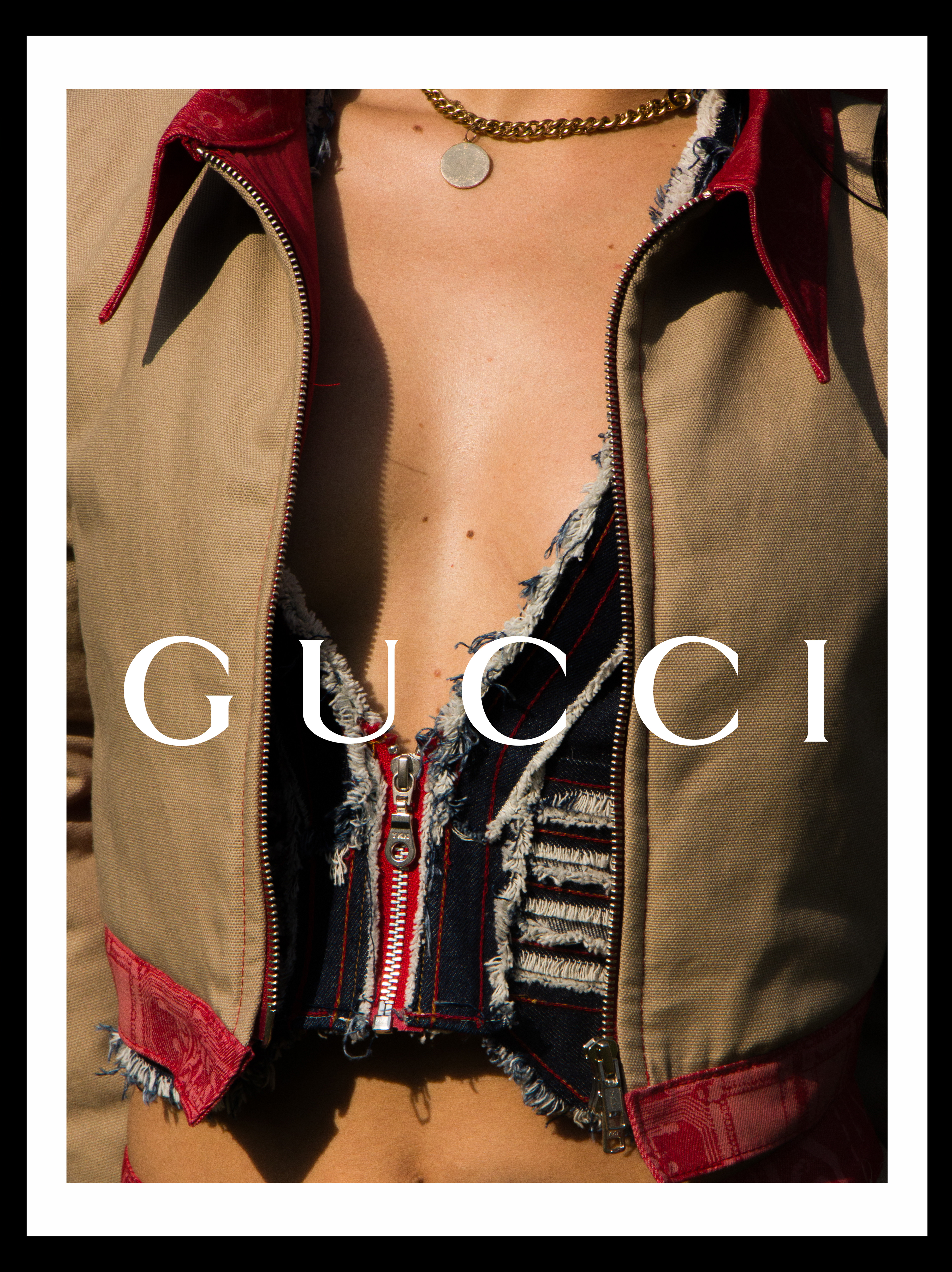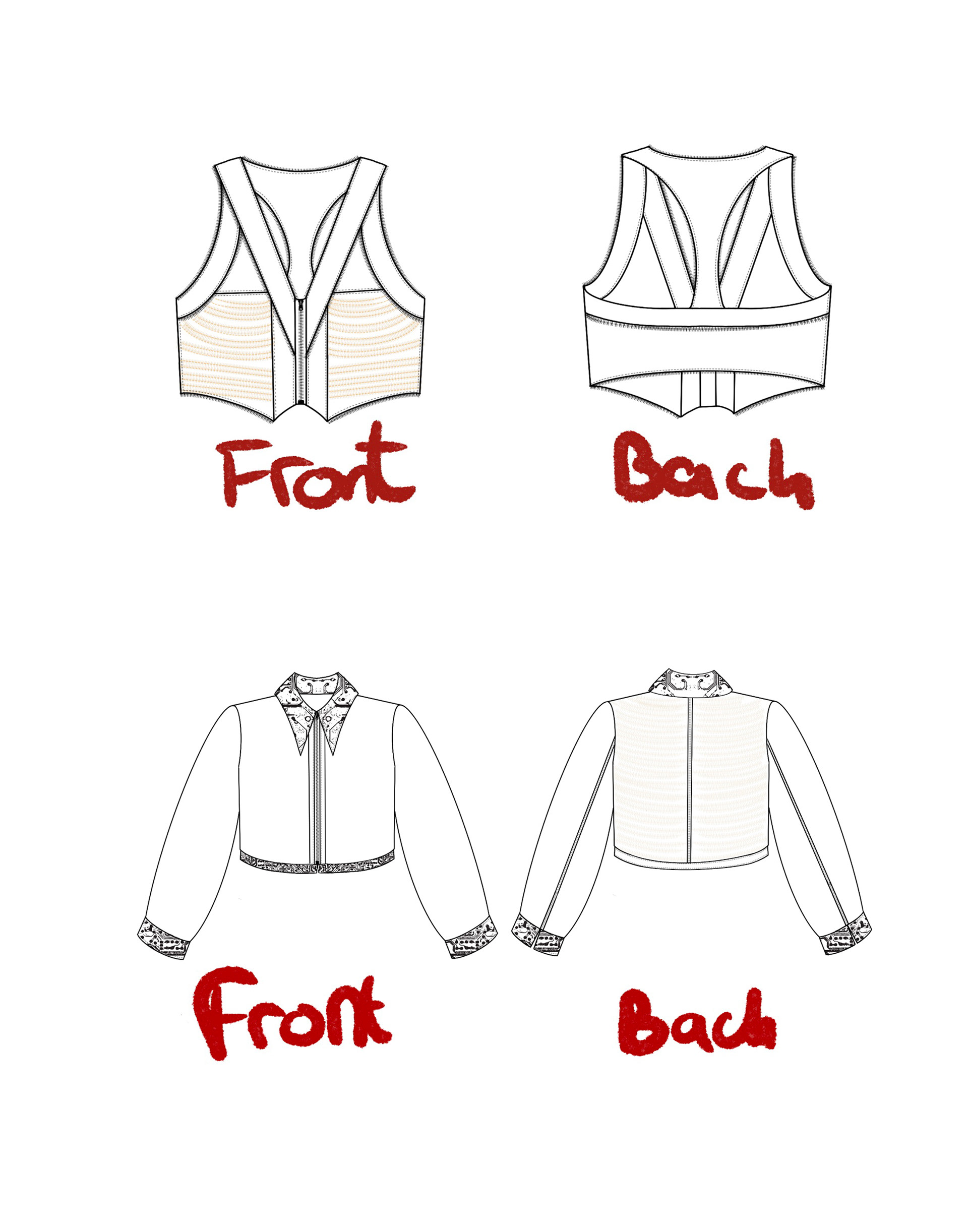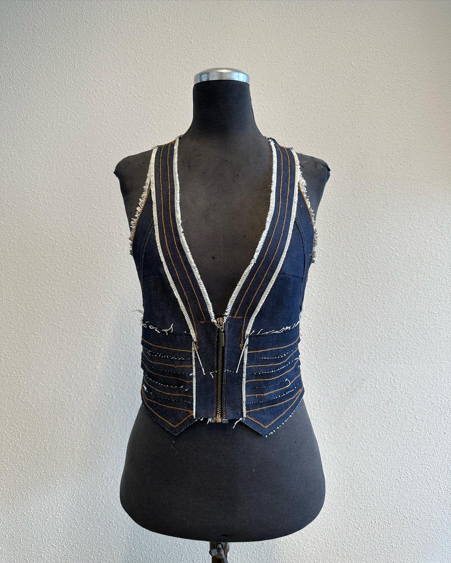 First Draft for a distressed denim vest with a Gucci by Tom Ford inspired low neck line.