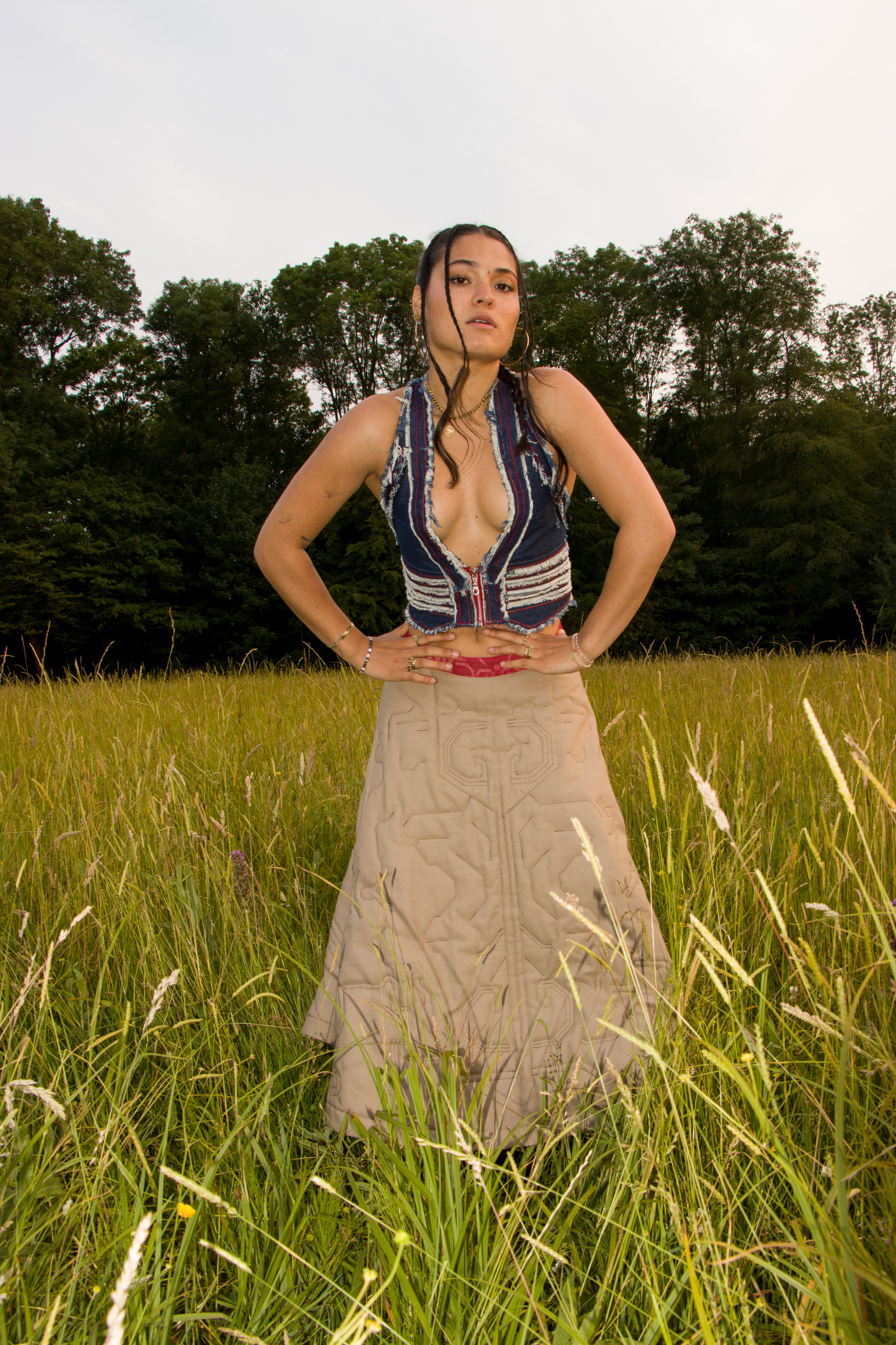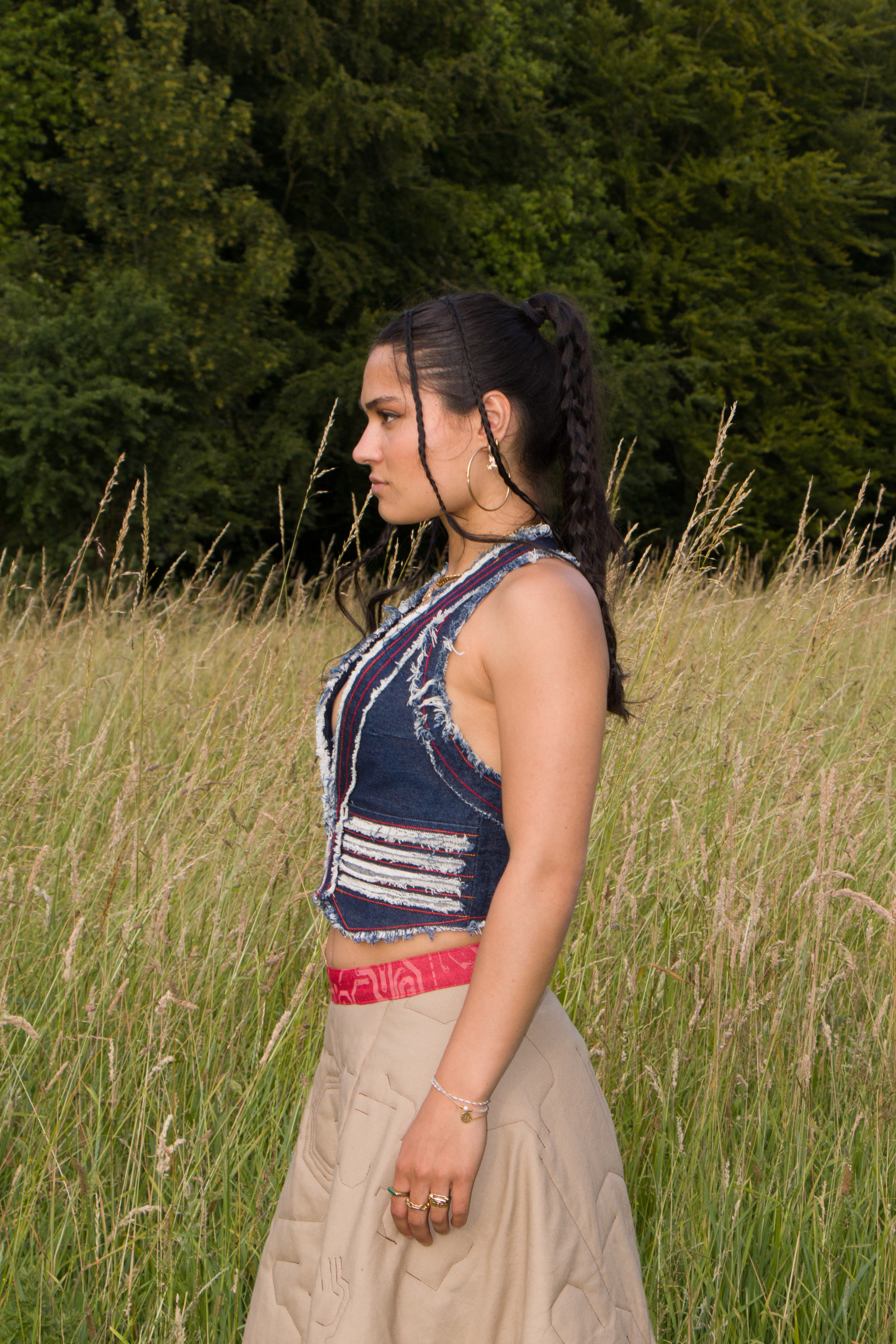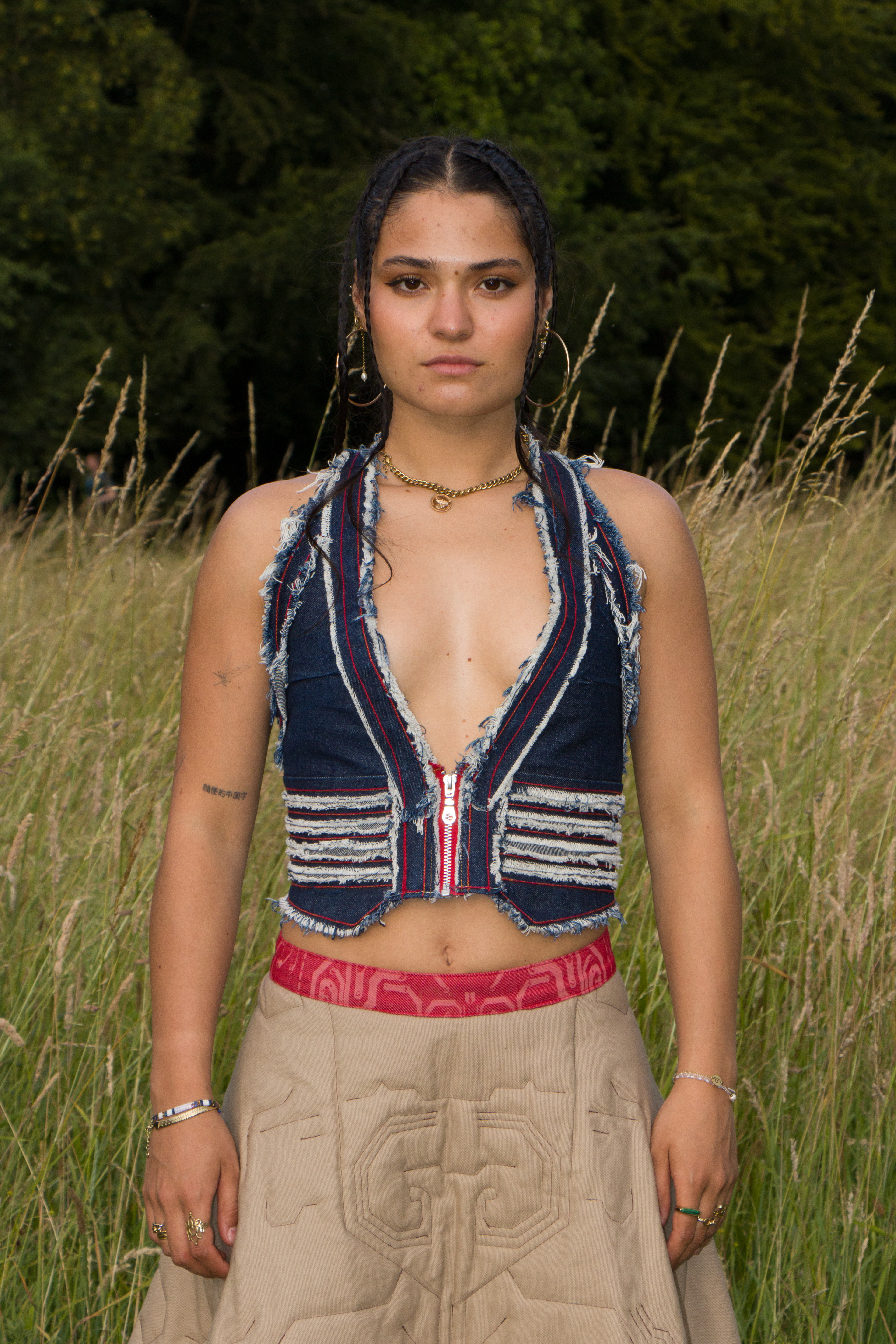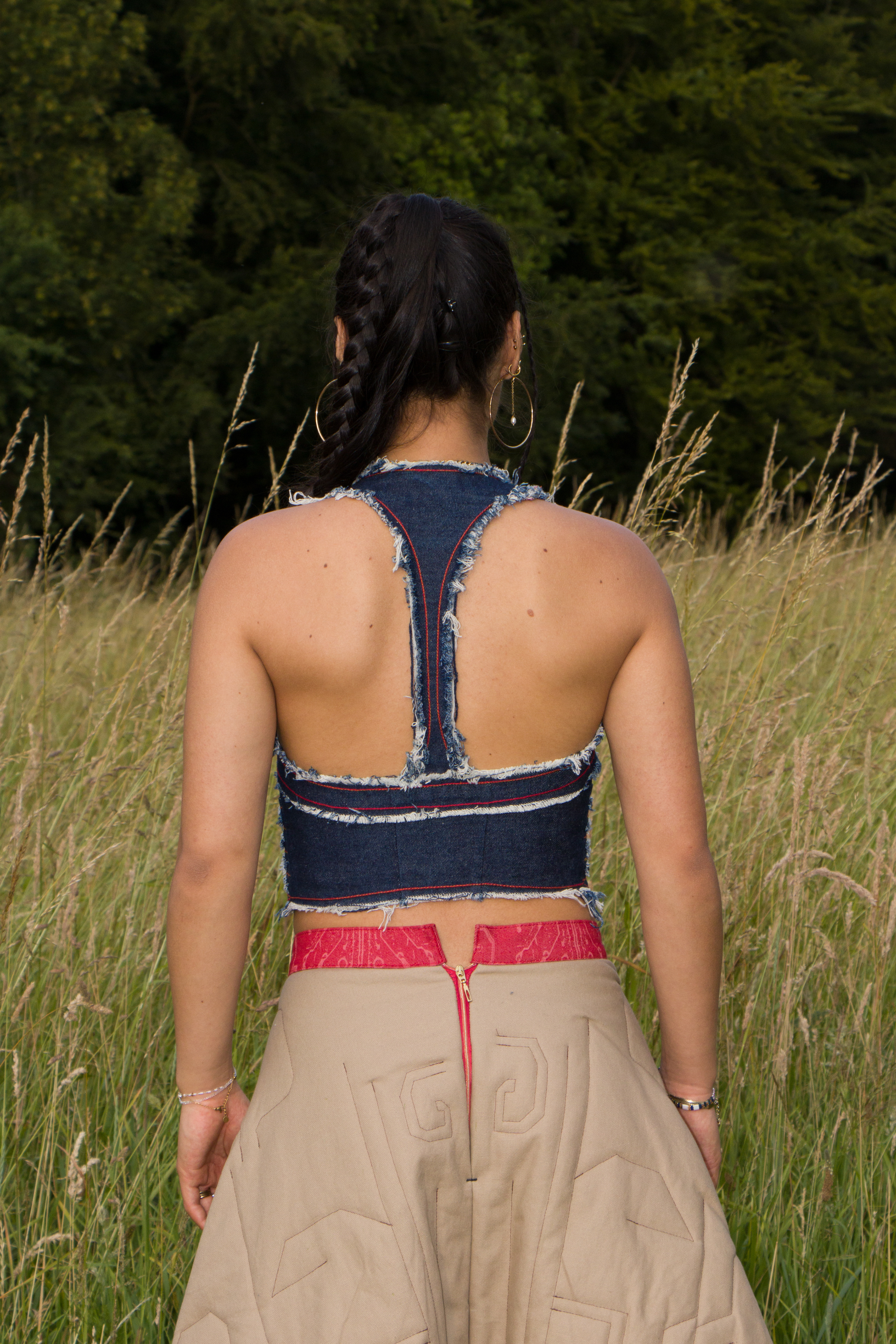 First Draft for a distressed denim vest with a Gucci by Tom Ford inspired low neck line.
