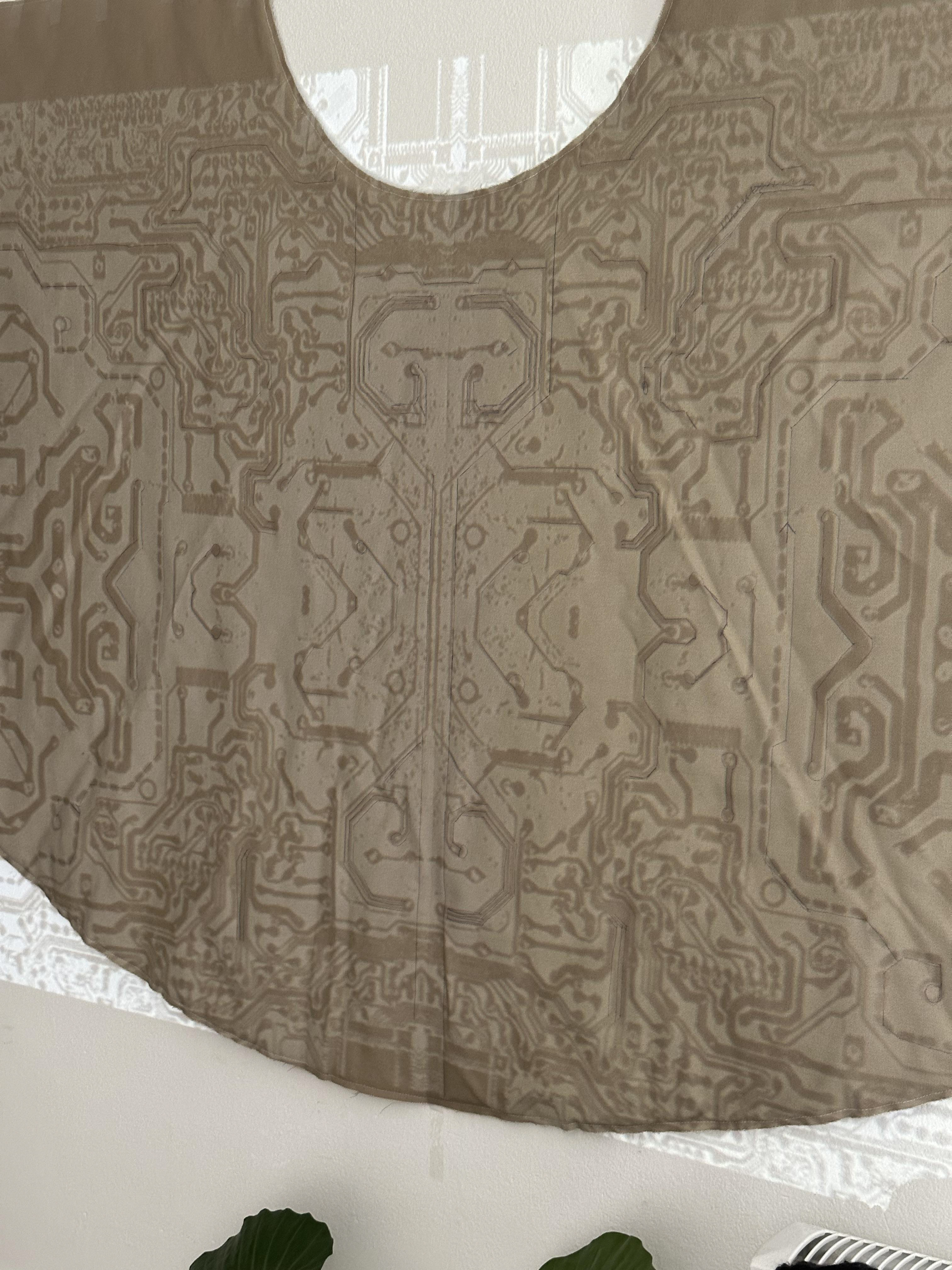 In order to quilt the skirt, which had a wingspan of about 2m I had to hang he skirt flat on the wall and project the mainboard motif onto the skirt, to trace the circuit/quilt lines.